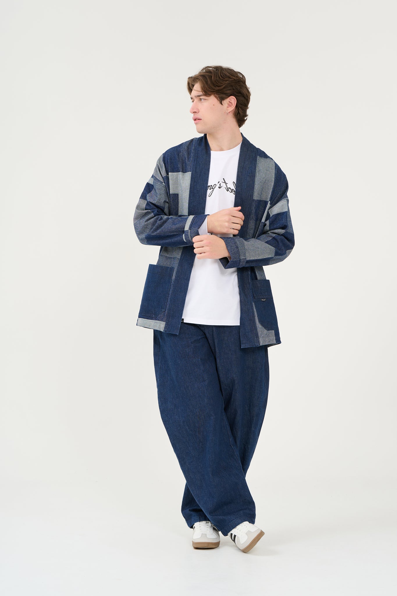 Kimono in tela denim Patchwork con bordo sul davanti e tasche in contrasto in tessuto unito denim.